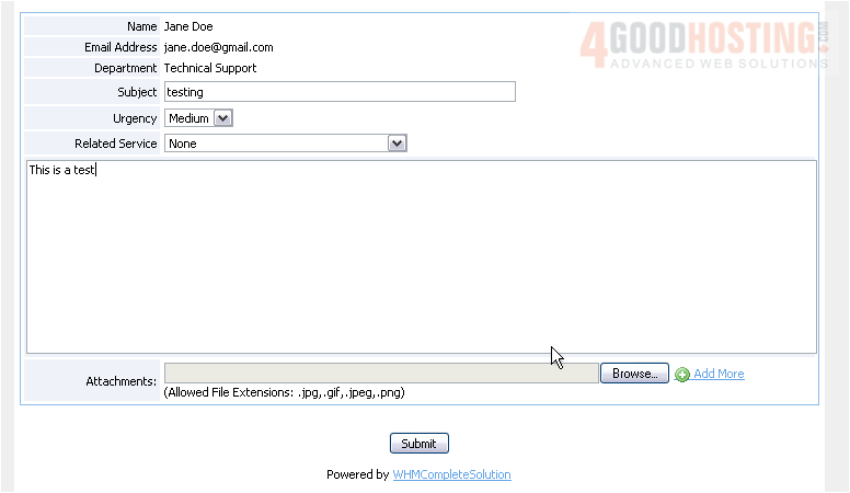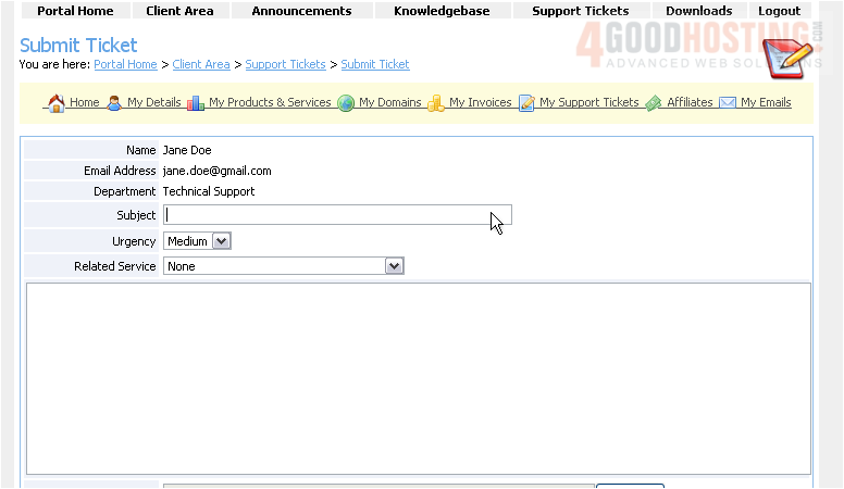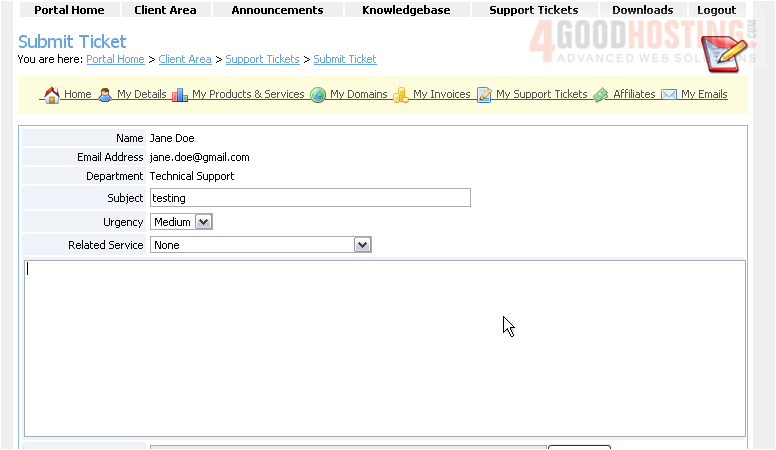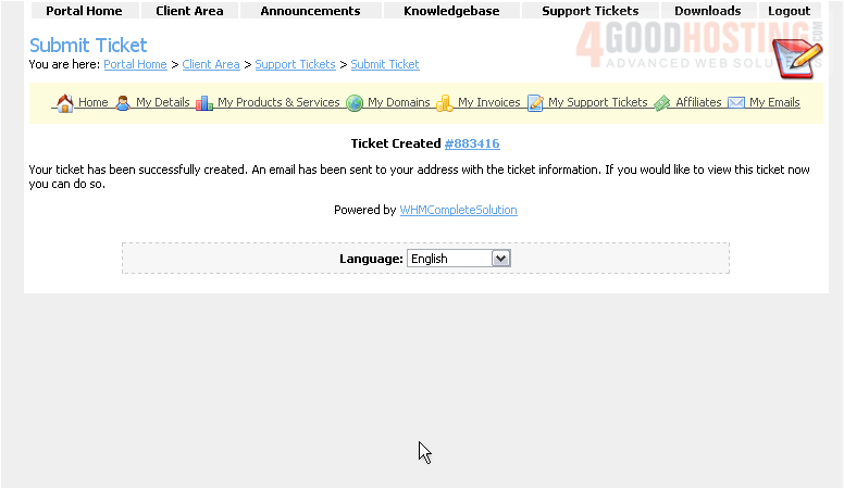 That's it! Â We've successfully created a support ticket, and a copy of the ticket has also been emailed to us