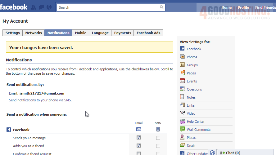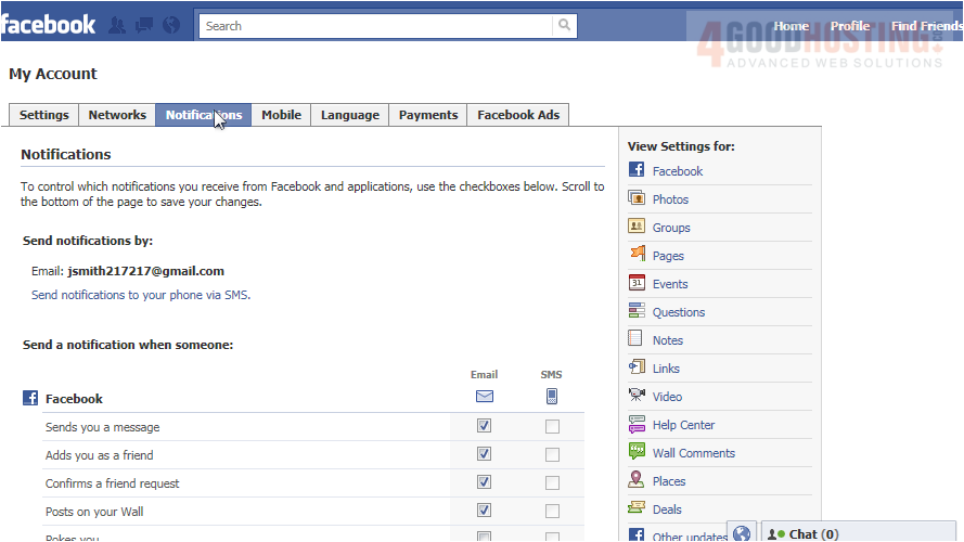 3) Go to the Notifications tab. Before you can receive SMS notifications, you will have to activate your phone with Facebook, which we will learn how to do later in this series.