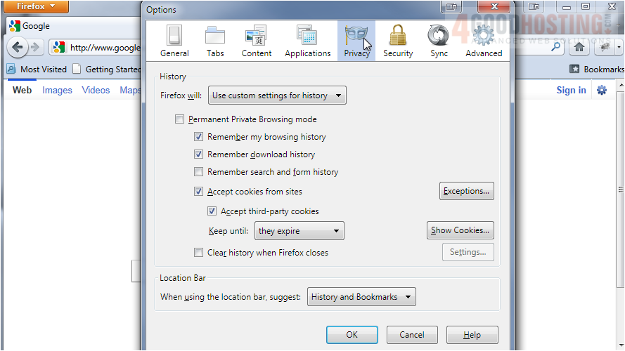 Here you can choose to have Firefox remember your browsing, download, and search and form history, and choose to accept or decline cookies from sites. We have covered these options in greater detail in previous videos in this series.