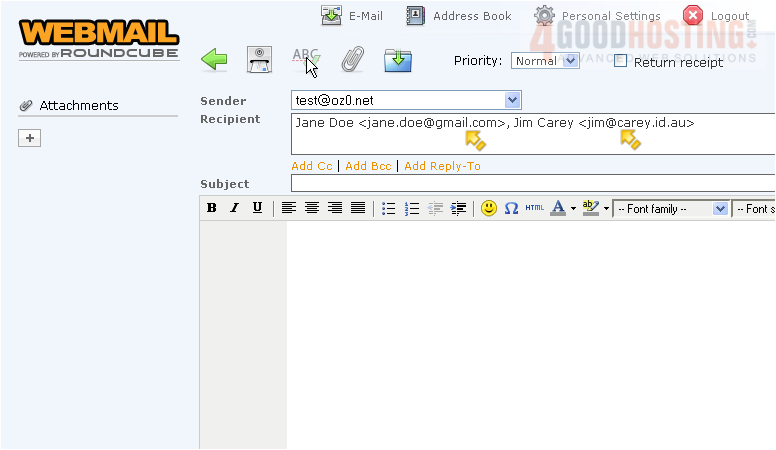 As you can see, the Compose Email window has opened, and our two contacts have automatically been inserted into the Recipient field