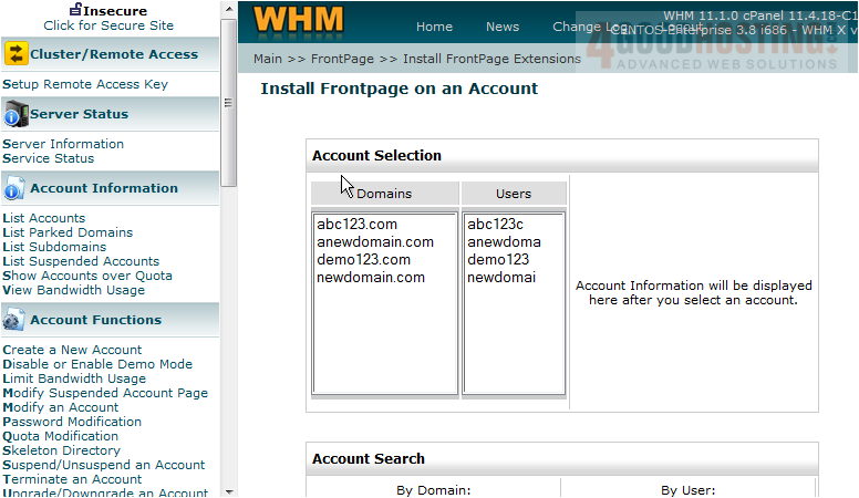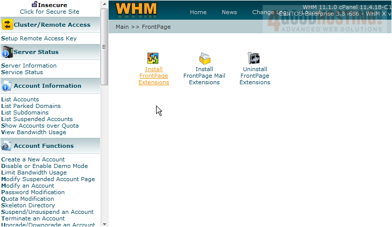 From here you can install (or uninstall) FrontPage extensions into any account in your reseller plan. Also be aware that your customers can do this with their own accounts themselves from their cPanel control panel